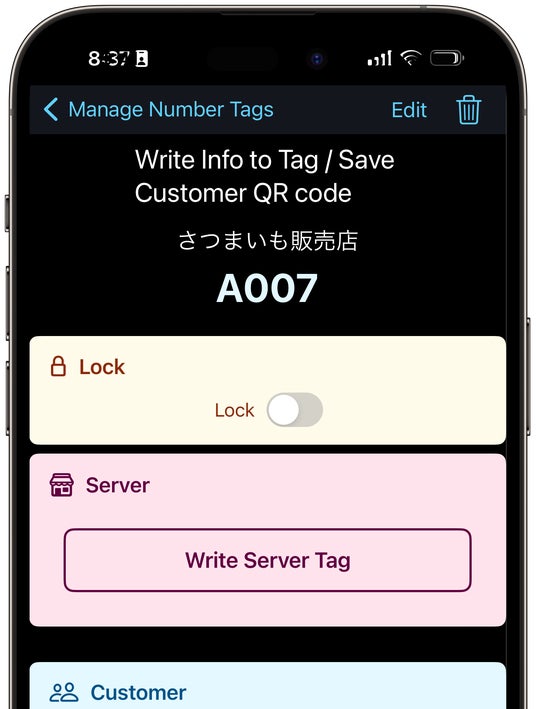 NFCタグへの書き込みペアになっているNumber Tag(Sever TagおよびCustomer Tag)あるいはCustomer QR codeに情報を書き込むことができます。