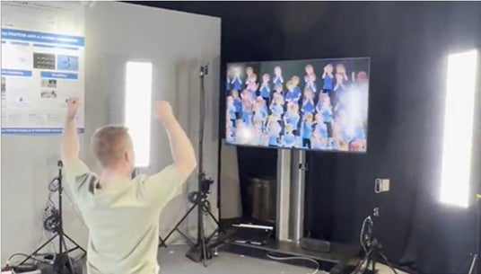 本イベントの会場には大型ビジョンと複数台のカメラを設置しており、大型ビジョンにバーチャル空間のサッカーフィールドを投影します。参加者がカメラの前でゴールパフォーマンス(※)を行うと、カメラで撮影した映像が瞬時に3Dデータ化され、バーチャル空間に映し出されることで、あたかも参加者がフィールド上でパフォーマンスをしているかのようなリアルな映像を再現します。