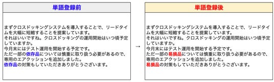 単語登録前後での音声認識・文字起こし精度は以下のようになります。登録された単語に対する文字起こし結果の改善が見られます。