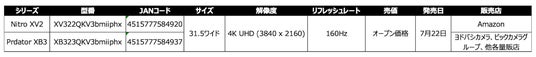 日本エイサー株式会社(本社:東京都新宿区、代表取締役社長:ボブ・セン)は、ここ数年でマーケットが拡大している高解像度ゲーミングモニター市場に向けて、新たにゲーミングモニターブランド Nitro より31.5 インチ4K ゲーミングモニター「XV322QKV3bmiiphx」と、ゲーミングブランド Predatorより同31.5インチ4Kゲーミングモニター「XB323QKV3bmiiphx」の計2 機種を、7月22日より発売いたします。「XV322QKV3bmiiphx」はAmazonから、「XB323QKV3bmiiphx」はヨドバシカメラ、ビックカメラグループ、他各量販店から順次発売されます。