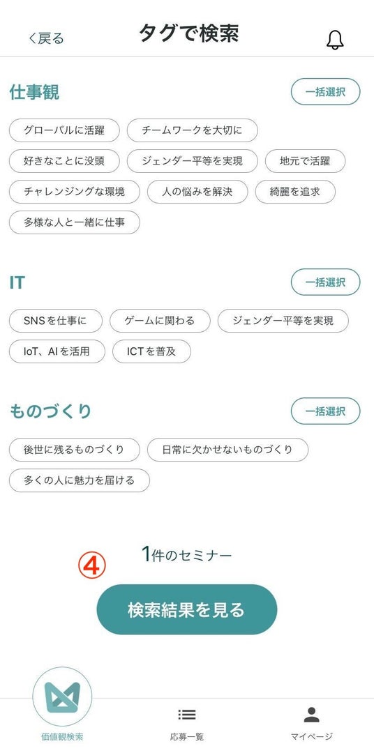 4.画面下部の検索結果を見るをタップし選択したタグを確認し申し込み