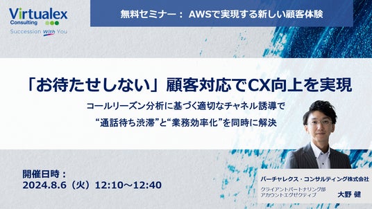 バーチャレクスグループのバーチャレクス・コンサルティング株式会社(本社:東京都港区、代表取締役社長:丸山勇人、以下、バーチャレクス)は、2024年8月6日(火)に、「『お待たせしない』顧客対応でCX向上を実現」と題したアマゾンウェブサービス(以下、AWS)の機能を活用したランチタイムウェビナーを開催します。