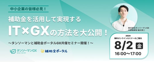 株式会社タンソーマンGX(本社:東京都港区、代表取締役:福元惇二)は、株式会社補助金ポータル(本社:東京都渋谷区、代表取締役:福井彰次)との共催で、「補助金を活用して実現するIT×GXの方法を大公開!」というタイトルの無料オンラインセミナーを2024年8月2日(金)に開催いたします。