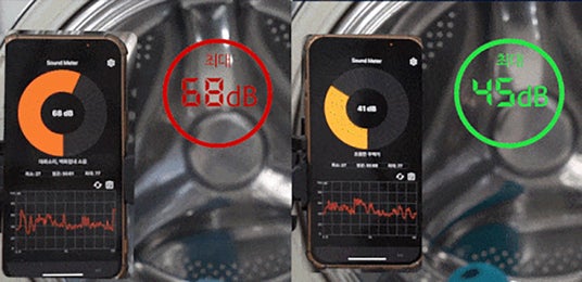 自社の既存製品とテストをしたところ、最大68db(既存)、最大45db(ドクターランドリー洗濯ボール)という結果に!