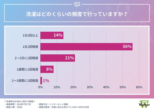 そこで、洗濯はどのくらいの頻度で行っているか伺ったところ、「1日1回程度(56.0%)」と回答した方が最も多い結果となりました。