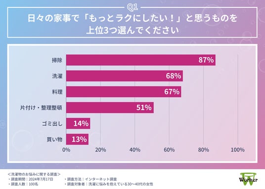 はじめに、日々の家事で「もっとラクにしたい!」と思うものについて伺ったところ、「掃除(87.0%)」「洗濯(68.0%)」「料理(67.0%)」が上位3つに選ばれました。