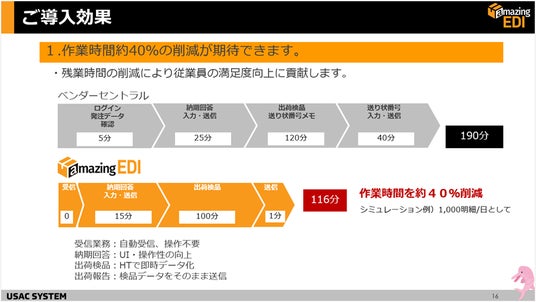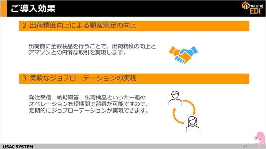 図3、4:amazingEDIの導入効果。作業にかかる時間を削減かつ、出荷精度の向上、業務の簡素化により、属人化を排除できる