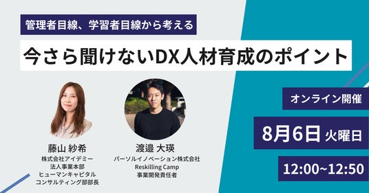 「はたらいて、笑おう。」をビジョンに掲げるパーソルグループのパーソルイノベーション株式会社 Reskilling Camp Company(本社:東京都港区、Reskilling Camp Company代表:柿内 秀賢)が展開する、リスキリング支援サービス『Reskilling Camp(リスキリング キャンプ)』( https://www.reskillingcamp.jp/ )は、株式会社アイデミーと、「今さら聞けないDX人材育成のポイント」と題し、2024年8月6日(火)12:00~12:50に共同オンラインセミナーを開催します。