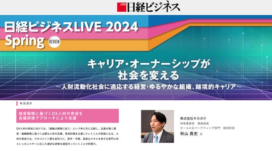 「日経ビジネスLIVE 2024 Spring」は「キャリアオーナーシップが社会を変える」をテーマに、2024年6月3日から5日にオンラインで開催されました。イベントでは経営、組織、人財をテーマにしたパネルディスカッションやソリューション紹介が行われました。キカガクからは研修事業部の責任者である秋山が登壇し、「DXを成功へ導く組織変革とは?DX人財育成の基盤づくりのポイント」と題して、DX人材育成とDX推進のポイントについて紹介しました。