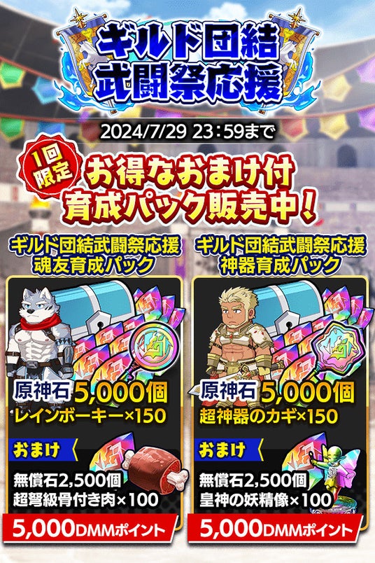 さらに、レインボーキーや超神器のカギがセットになった「ギルド団結武闘祭応援育成パック」も2種登場!おトクに原神石を購入できるチャンスですのでお見逃しなく。