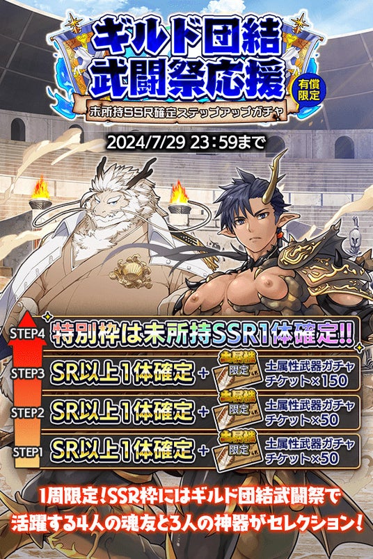 また、ステップごとにおトクなおまけがついた1周限定の「ギルド団結武闘祭応援未所持SSR確定ステップアップガチャ」も開催!