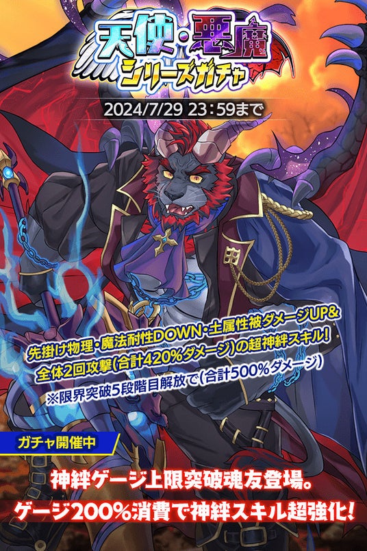 今回は「ヴァレフォル」が登場します。本ガチャでは、過去の天使・悪魔シリーズガチャに登場した「ゴルード」「セルバート」「アイシュエル」「ダンタリオン」「フォカロル」も入手可能です。いずれも神絆ゲージ上限突破スキルを持つ強力な魂友なのでお見逃しなく!
