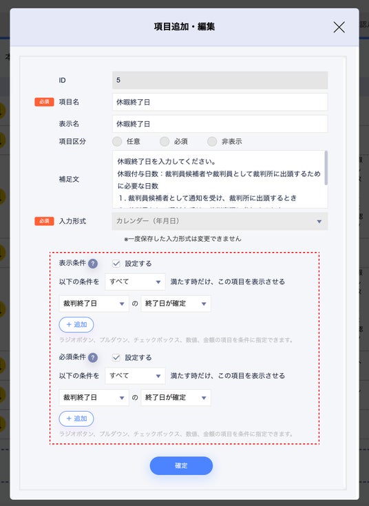 1.従業員が「裁判終了日:終了日が確定」を選択した際には「休暇終了日」を必須入力項目として表示