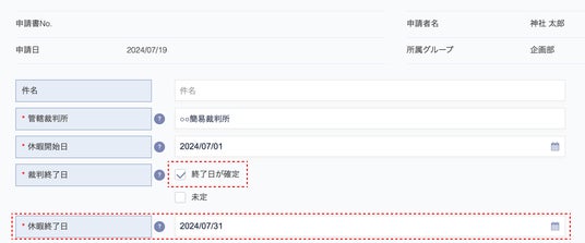 2.従業員が「裁判終了日:未定」を選択した際には「休暇終了日」を入力する項目を非表示