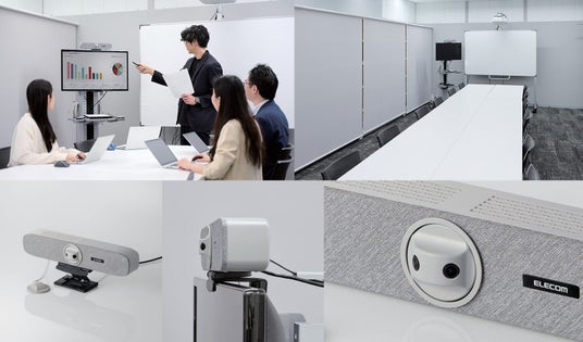 本製品は2つのレンズにより水平角180°の画角を確保し、大きな会議室でも見切れることなくすべての参加者を映すことができます。さらに、発言者の音声をクリアに届けるビームフォーミングマイクと、最大出力5Wのスピーカーも内蔵したオールインワンタイプで、付属のUSB Type-C(tm)(USB-C(tm))ケーブルを接続するだけで配信可能です。