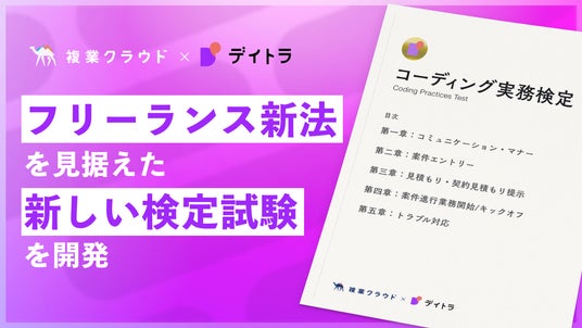 複業したい個人と企業や自治体を繋ぐ、総合型複業マッチングプラットフォーム「複業クラウド」を運営する株式会社Another works(本社:東京都港区、代表取締役:大林 尚朝、以下「Another works」)は、株式会社デイトラ(本社:東京都豊島区、代表取締役:大滝昇平、以下「デイトラ」)と業務連携し、「コーディング実務検定」の開発に協力したことをお知らせいたします。本検定はWeb制作などのコーディング業務に従事するクリエイターを対象とし、専門的な知識だけではなく業務委託/複業として働く際のマナーやマインドセット、トラブル対応などまでカバーしています。本検定の取得により、複業の実務経験が無かった方でも最低限の知識や心構えを持ち安心してフリーランスや複業に挑戦することができます。Another worksは今後も当社のビジョンである「挑戦する全ての人の機会を最大化する」に向けて市場全体の健全性を高めてまいります。