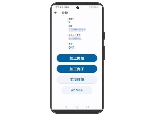 工程が進むたびに、専用のスマホアプリで部品のQRコードを読み取ります。表示される工程の開始・終了ボタンをタップすると、実績が登録されます。余計な手間は取らせません。