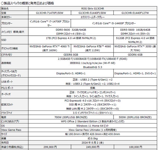 第14世代 インテル(R) Core(TM) プロセッサーを搭載し、ハイパフォーマンスを実現するゲーミングデスクトップPC「ROG Strix G13CHR」を発表