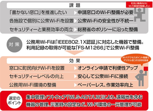 公共施設の業務効率化のためWi-FiによるLGWAN接続系の無線化を実施。役場と各施設のVPN接続により管理を一元化、公衆Wi-Fi提供も可能に