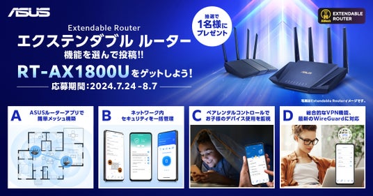 ASUS JAPAN株式会社は、RT-AX1800Uが1名様に当たるExtendable Router X(旧Twitter)キャンペーンの開催を発表しました。