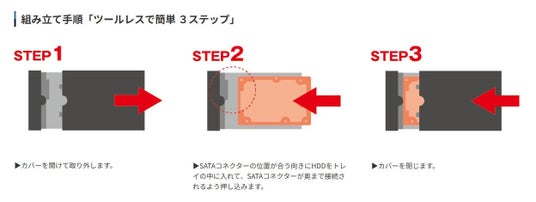 組み立ては、「カバーを開けて」→「HDDを取り付けて」→「カバーを取り付ける」だけの簡単3ステップ!