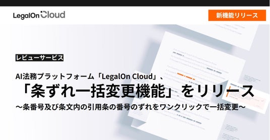 株式会社LegalOn Technologies(本社:東京都渋谷区 代表取締役 執行役員・CEO:角田 望)が提供する、法務業務全体を包括的に支援するAI法務プラットフォーム「LegalOn Cloud」は、「条ずれ一括変更機能」を搭載しました。「条ずれ一括変更機能」の搭載で、条番号及び条文内の引用条の番号のずれがワンクリックで一括変更できるようになり、契約書修正業務の業務効率化を支援します。