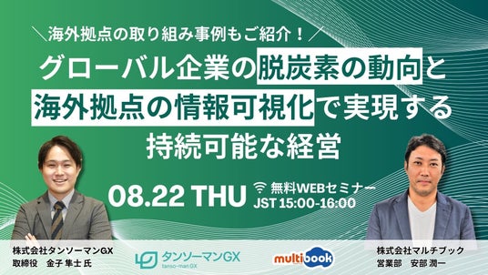 世界的な脱炭素化の流れにおいて、日本企業の海外拠点での脱炭素への取り組みがますます重要視されています。株式会社タンソーマンGXと株式会社マルチブックの共催セミナーでは、世界の脱炭素経営の動向から具体的な取り組み事例までをご紹介します。特に、グローバル企業にとって重要な海外拠点管理の課題とその解決方法についても事例を交えて解説します。