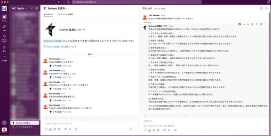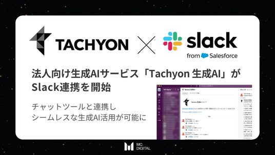 テクノロジーをもって企業の課題解決を支援するエムシーデジタル株式会社(本社:東京都千代田区、代表取締役社長:河内 伸学)は、同社が開発を進めるGPT/Gemini/Claudeの複数LLM利用が可能な法人向け生成AIサービス「Tachyon 生成AI」に、ビジネスチャットツール「Slack」との連携機能を新たに搭載しました。本機能により、Slack上で直接生成AIと対話することが可能となり、日常業務における生成AI活用の利便性が大幅に向上します。