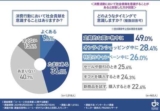 次に、「消費行動において社会貢献を意識することはありますか?」と質問したところ、『よくある(9.6%)』『たまにある(36.1%)』『あまりない(40.7%)』『全くない(13.6%)』という回答結果になりました。