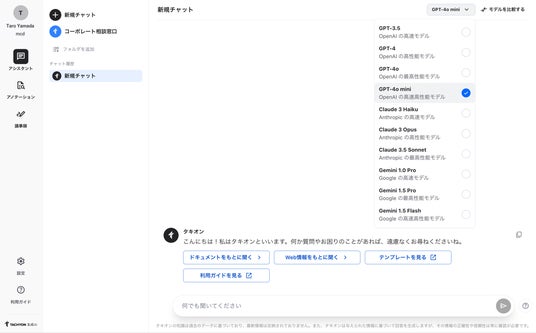 - チャット機能:GPT/Gemini/Claudeの複数LLMから選択して生成AIとチャット形式での対話が可能。画像を入力としたマルチモーダルな会話や、文書ファイルを活用した要約やQA機能も搭載。