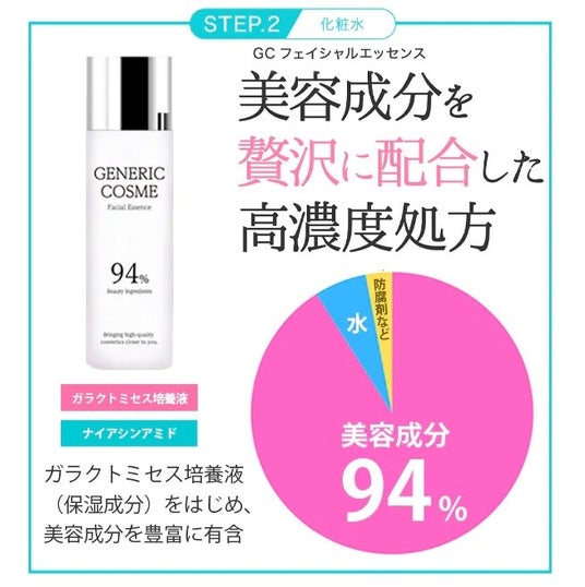 ■ GC フェイシャル エッセンス(化粧水)145ml一般的に化粧水は全体のほとんど(約80~90%)が水によって構成されていますが、GC フェイシャル エッセンスは全体の94%がガラクトミセス培養液(保湿成分)をはじめ、美容成分を贅沢に配合した高濃度処方です。