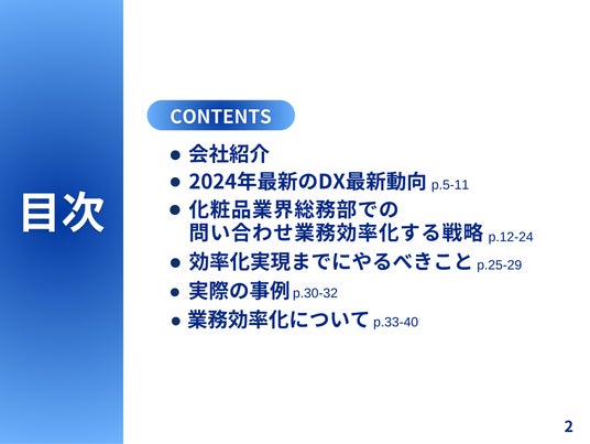 株式会社ベクトル(本社:東京都港区、代表取締役会長兼社長:西江 肇司、東証プライム:6058)の子会社であるOwned株式会社(東京都品川区、代表取締役社長、石井翔、以下「当社」)は、DXの最新トレンドをまとめた「化粧品業界総務部向け|問い合わせ業務を効率化する5つの戦略レポート」の2024年7月版(全40ページ)を無料公開いたしました。