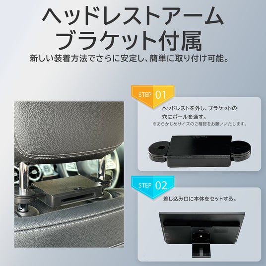 ヘッドレストアームブラケット付き簡単2ステップで本体を固定できます。