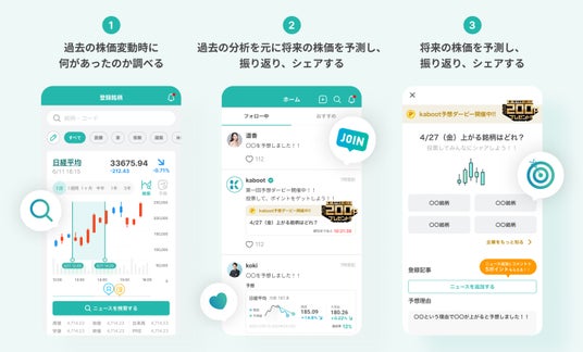 株価チャートから直接ニュース検索するUXで株価変動要因のリサーチコストを大幅に削減。さらに予想をシェアし、『株価予想ダービー』を競い合う体験型の投資学習SNS『Kaboot』のβ版を提供開始。