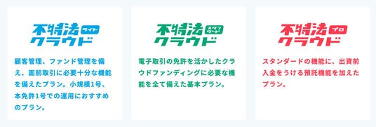 『不特法クラウド』は、面前のみからクラウドファンディングまで、事業者の導入フェーズや事業規模に合わせた3つのプランをご用意しています。
