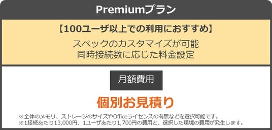 こうしたリモートワーク関連コストの最適化を求める声をうけ、NexTop Cloudは同時接続数に応じた新料金プラン『Premiumプラン』の提供を開始します。当プランでは初期費用なしというNexTop Cloudの特長はそのままに、リモートワークの状況にあわせたスペックのカスタマイズも可能となっています。