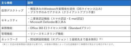 NexTop Cloudは仮想デスクトップのみを提供する従来型のDaaSとは異なり、リモートワークを始めるために必要な機能をあらかじめ備えた状態で提供しています。主な機能は下記の通りです。