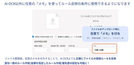 これまではファイルの「発行元」をもとにした登録ルールのみ作成できましたが、今回のアップデートでは「メモ」の欄に記入された情報をもとにしたルールを作成可能となりました。これにより、ファイルアップロード時に任意の文字(=メモ)を入力することで、メモの内容と条件が一致するルールが自動で適用されるようになります。