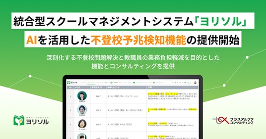 統合型スクールマネジメントシステム「ヨリソル」は、従来の教育データの管理・分析といった教育ダッシュボードに加え、新たにAIを活用した不登校予兆検知機能を提供開始しました。これにより、システムの乱立やデータの散在課題を解消するだけでなく、不登校児童生徒の傾向もダッシュボード化し、さらには不登校予兆発見後の学校側の対応状況をモニタリング、対応レコメンドすることが可能となります。