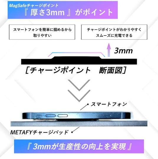 磁力により的確にチャージポイントと接続できることで、位置ズレによる充電漏れを防ぎMAX出力15Wの急速充電を逃さない。まさに”ノンストレスチャージ”。従来のワイヤレス充電では、わざわざ位置を的確に合わせなくてはいけない。これが大きな欠点である。まだ充電にはケーブルを使っていますか?ワイヤレス充電であれば、デスク上という“最も重要な環境”において、作業スペースが整理され、よりクリエイティブなワークを実現できる。忘れてはいけない。インタネットにおけるすべての創造は、