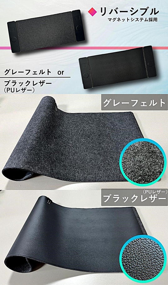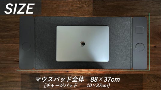 ●大型サイズ: 横88×37cmの広々としたマウスパッドで、十分なスペースを提供。 ●両サイドワイヤレス充電機構: 左右どちらでもスマートフォンの充電が可能。MagSafe対応: MagSafe対応スマートフォンであれば、位置を気にせず簡単に充電可能。MAX出力15Wの急速充電で素早く充電できます。マグネットで取り外し可能: 充電部分はマグネットで簡単に取り外せます。スマートフォンを充電しながら、立てかけたり横に置いたりすることが可能。 ●リバーシブルマウスパッド: フェルト生地とブラックPUレザーの2面があり、お好みや用途に合わせて使い分けが可能。