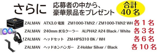 本キャンペーンは、BTOパソコンを含むピラーレスデザインのZALMAN社製PCケース「P10」シリーズ及び「P30」シリーズが対象となります。今回の景品として、応募者全員にZALMANオリジナルマウスパッドをプレゼントするほか、同社製品のATX 3.0電源ユニット「ZM1000-TMX2」、240mm水冷一体型CPUクーラー「ALPHA2 A24」、ゲーミングヘッドセット「ZM-HPS310」、ヘッドホンハンガー「Z-Holder」を抽選で計40名様にプレゼントいたします。