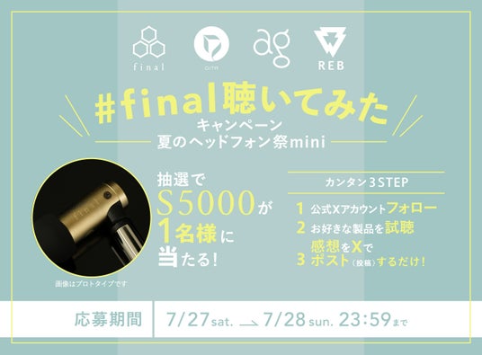 また、Xにて「#final聴いてみた」のハッシュタグと共に、試聴したfinal製品の写真と感想を投稿していただきますと、新イヤホンモデルS seriesの真鍮筐体モデル「S5000」が抽選で1名様に当たるキャンペーンを開催いたします。皆様の投稿をお待ちしております!