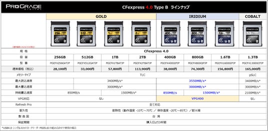 ProGrade Digital Incorporatedは、CFexpress 4.0 Type B IRIDIUM 400GB/800GB/1.6TB VPG400メモリーカードを、本日Amazon.co.jpで発売しました。税込価格は、それぞれ38,000円、74,300円、156,800円です。