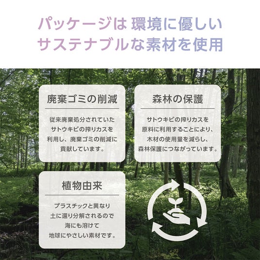 パッケージには、従来廃棄処分されていたサトウキビの搾りカスを利用し、廃棄ゴミの削減に貢献。木材の使用量を減らし、森林保護につながっている他、プラスチックと異なり植物由来で土に還り分解されるので、海にも溶けて地球にやさしい素材です。