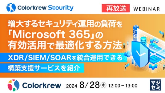 さらに、2023年に日本マイクロソフトの「Secure multicloud environment Award」を受賞したColorkrewが提供する「Microsoft 365セキュリティ支援」サービスを紹介。独自の脅威検知機能や柔軟なアラートのカスタマイズなどに加え、Microsoft 365ライセンスで使用可能なセキュリティ・サービスの導入支援、その後の監視運用まで総合的に支援するソリューションについて、その概要や導入効果などをご説明します。「セキュリティベンダーや製品を統合したい」「セキュリティ運用のコストを抑えたい」という方は、ぜひご参加ください。