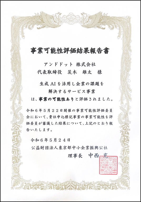 アンドドット株式会社(本社:東京都渋谷区、代表:茨木雄太)は、同社が展開する「生成AIを活用し共創事業」が、公益財団法人東京都中小企業振興公社より「評価事業」と位置付けられました。