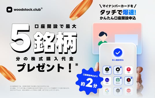 Z世代が選ぶSNS型投資アプリ、Woodstockがリニューアル!マイナンバーカードタッチで口座開設で、5銘柄プレゼント!