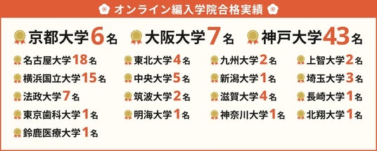 多くの学生からは、「きめ細やかな指導のおかげで、自信を持って試験に臨むことができた」、「柔軟な支払いプランのおかげで、経済的な負担を感じずに学習を続けることができた」といったお声をいただいております。実際に、オンライン編入学院の指導を受けた多くの学生が、難関大学への編入を果たしており、その成果は高く評価いただいております。編入試験でも最難関となる京都大学の合格者専有率は3年連続で50%を超えています。