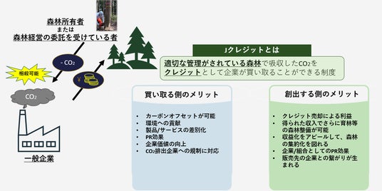 森林の所有者又は森林経営を委託された事業者等が適切な森林経営を行うことで、森林の成長による炭素吸収量を「クレジット」として販売することが可能な制度です。森林経営計画を作成されている森林をお持ちの方は、クレジット創出による収益化が実現可能となります。